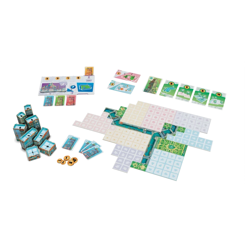 The small town of Bella Vista, with its scenic parks and winding rivers, is a great place to live—and you areits architects. To win, carefully select the best locations for your buildings in order to complete the most valuable contracts, while adhering to zoning regulations imposed by the mayor’s office. Competition is fierce: strategically choose your position in the construction order and be prepared to pay a high price for the most coveted spots. When all eight of your buildings have been built, the game ends. If you are the wealthiest architect, you win!