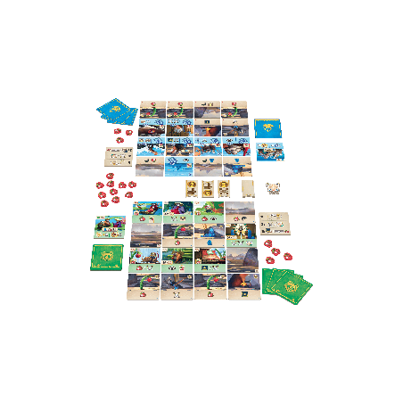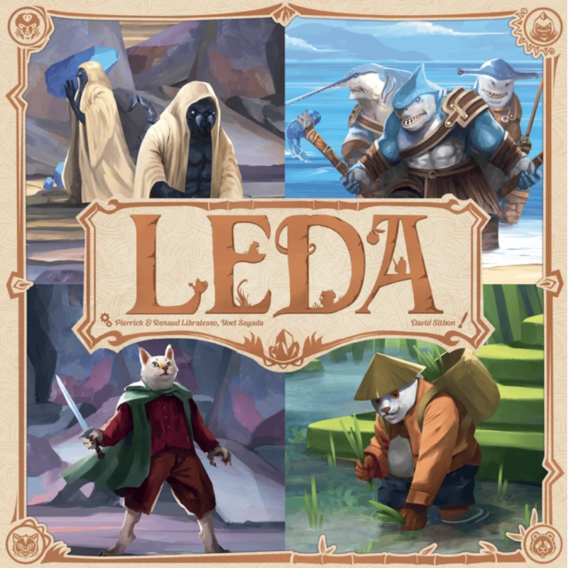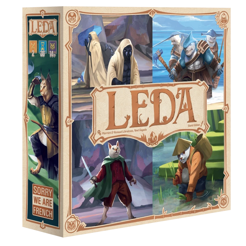 LEDA is an asymmetric card game for two players in which each player embodies an animal clan with its own rules, objectives, and playstyle. Each player begins with a 4x4 grid of basic tiles, which they will modify during the game by upgrading them and playing clan cards onto them. On each turn, the action tile determines a zone of the grid to activate, triggering the effects located in that zone. Players must optimize their activations, manage their food (the main resource), and improve their engine in order to fulfill their clan's unique victory condition — all while racing for military victory!