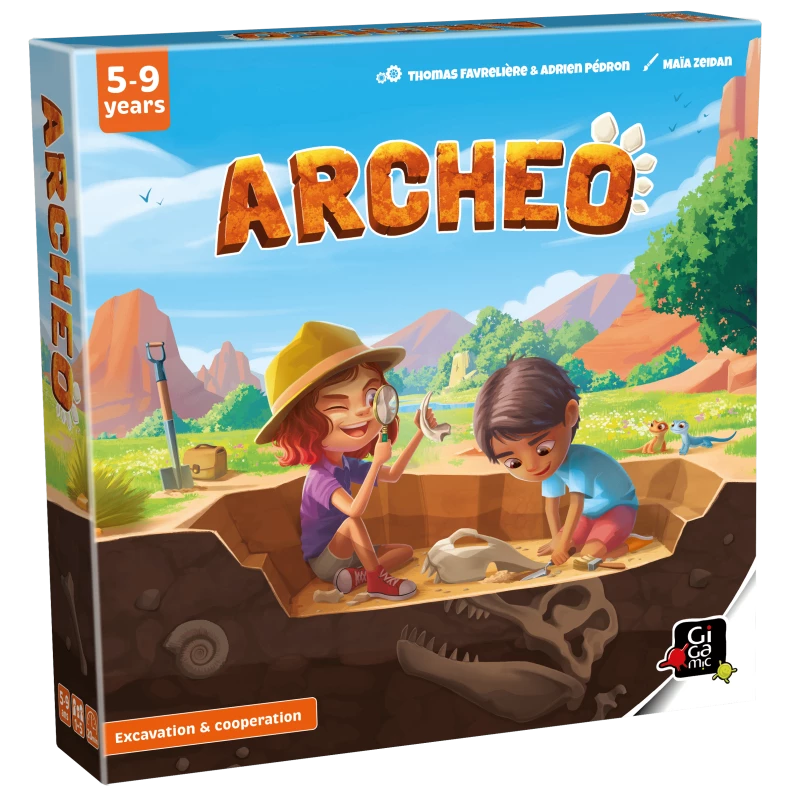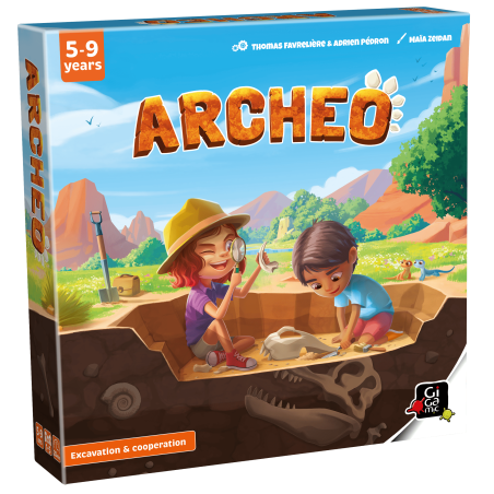 1 dig site, 50 Terrain tiles, 4 Discovery tiles, 5 Fossil boards, 1 suction shovel, 3 wooden eggs, 1 hexagonal token, 5 Wheelbarrow tokens, 11 cards, and the rulebook. |