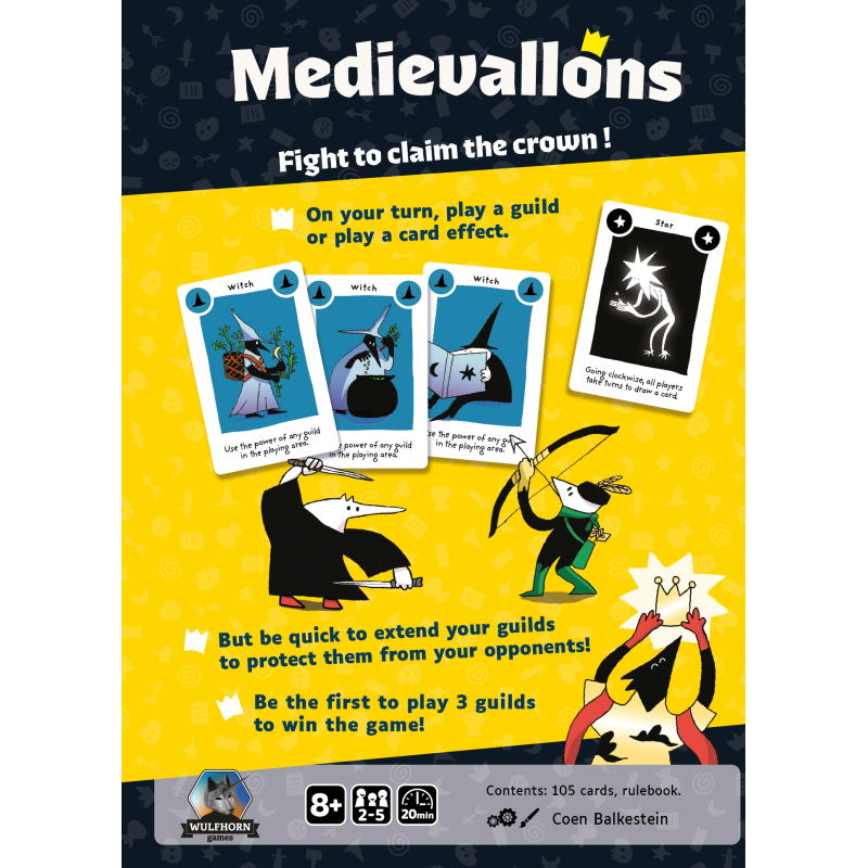 The beloved monarch has died, creating a power vacuum. Players compete to establish three guilds and dominate the capital to claim the crown. Choose guilds wisely, each with unique powers, for a strategic and fast-paced battle. Can you outwit your rivals and seize control? In Medievallons , fight to be the first to establish 3 guilds and harness their powers to dominate the capital and claiming the kingdom! With 13 unique guild cards, players must balance strengthening their own position with disrupting others. A quick, strategic game lasts about 30 minutes. Players draw a guild card each turn and must decide: play it for a powerful effect but lose it, establish a new guild at risk of attack, or add members to protect it but slow progress. The goal is to establish 3 guilds, each made of three matching cards. If a guild drops below three members due to interference, its cards return to the player’s hand. The game ends when a player completes their third guild and claims victor